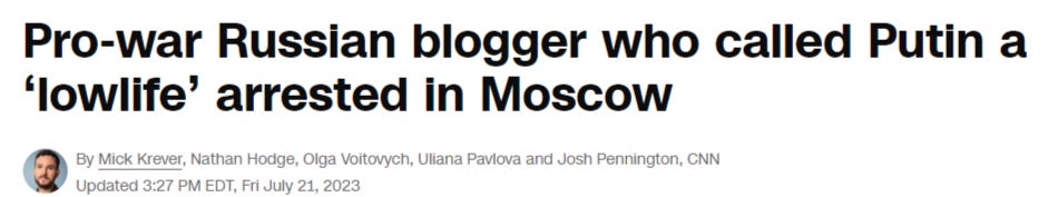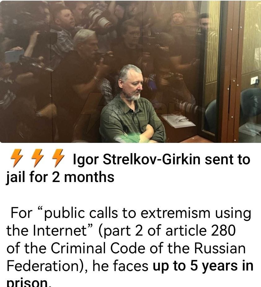 Now, keep in mind that I didn’t miss the irony of the ‘Wagner doctor’s’ complaint about Strelkov. Here is Wagner, fresh from having carried one of the largest rebellion attempts in Russia’s recent history, is accusing Strelkov of sedition; classic pot and kettle. Moreover, there does appear to be—on the surface at least—a notably unfair injustice in the fact that Prigozhin has been allowed to go free without punishment while Strelkov is now detained.