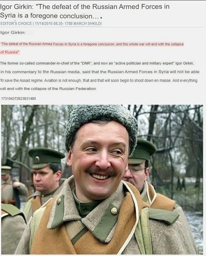 In 2015, after all, Strelkov famously predicted that Assad would fall, that Russia’s airpower would be too weak to hold back the rebels, and that after catastrophically losing in Syria, Russia would collapse, leading to Putin’s ouster (is he just obsessed with Putin’s overthrow, or what?)