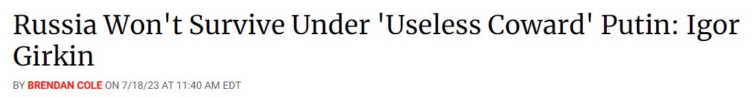 But one must note that Prigozhin made specific note to never take his case overtly or ostensibly against Putin; he never even mentioned his name during his screeds. Thus, when he carried out his actions, it gave them the character of being more a squabble among generals/commanders, rather than a genuine coup d’etat against the Kremlin or presidency. Strelkov, on the other hand, openly began to call for Putin’s dismissal or overthrow, using increasingly less euphemistic language.