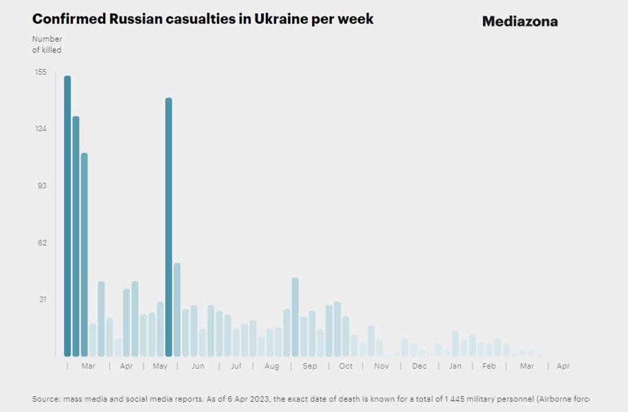 Also, I’d like to note that just like the infamous Russian 155th marines “catastrophe” in Ugledar which were debunked by confirmed MediaZona obituaries, showing they actually lost only a few dozen people or less, similarly MediaZona posted figures for Russian VDV losses during the Gostomel days and they were likewise very low, particularly compared to Ukraine’s claim of the VDV being “completely decimated” and basically “ceasing to exist”.
