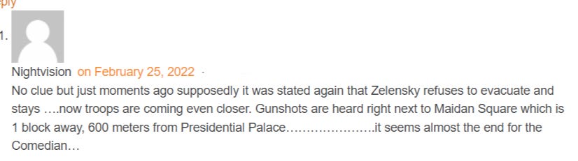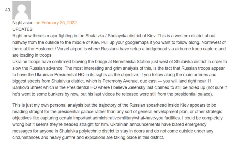 For instance, you’ll note that late on February 25th, on day two of the conflict Russian special ops troops were already working their way down Peremogy Avenue, bee-lining toward Maidan Square and Bankova St. area where Zelensky was holed up:
