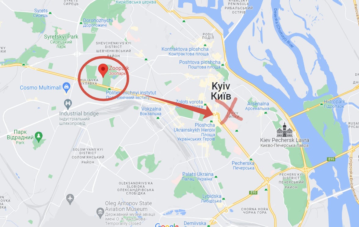 The zoo is circled, the red arrow is Peremogy Ave down which Russian forces were advancing, and the red X is Bankova, presidential HQ. Right next to Bankova, a block or two away, is Maidan Square—and here you can see on the same night of 2/25, I was already reporting the following: