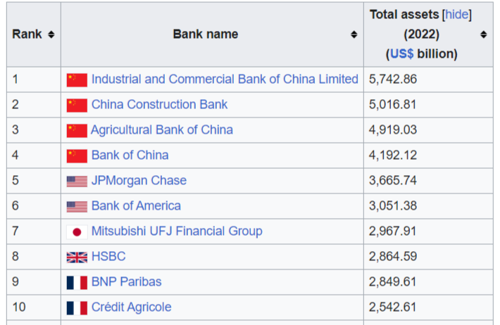 In general, I believe that the Western financial system is at its most dire and critical point in history. For the first time, a rival bloc/system is arising which threatens to completely cut off the West and immunize itself of all their most valuable instruments, like SWIFT and various banking interconnections. Just look at the list of current top 10 banks in the world by total assets:
