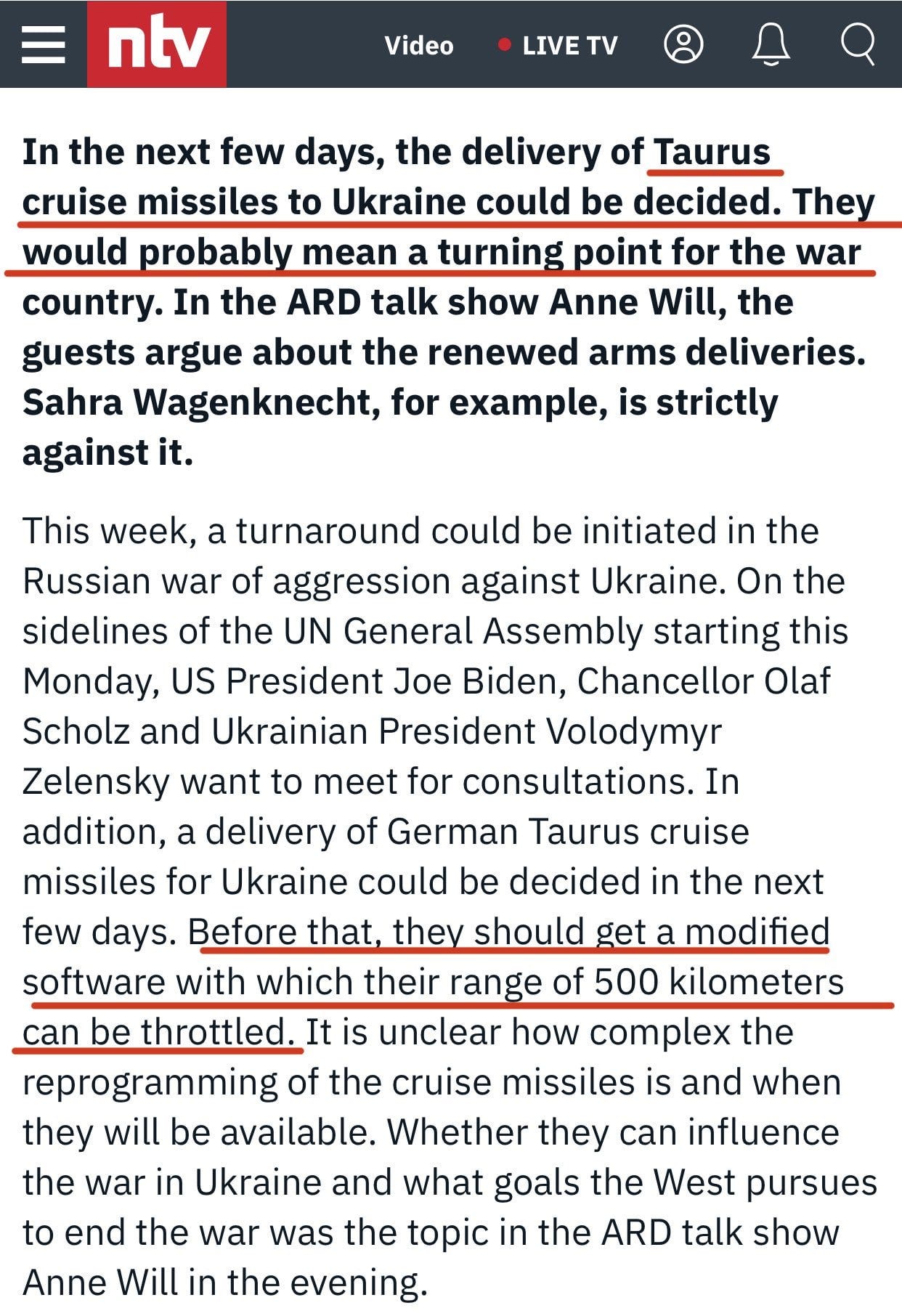 Now Germany too is considering gimping their Taurus missiles before potentially supplying Ukraine: