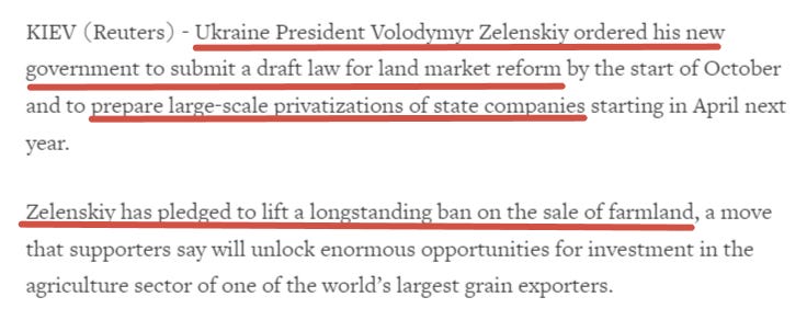 As soon as he took office in 2019, Zelensky immediately ordered the privatization of Ukrainian farmland as one of his first major acts: