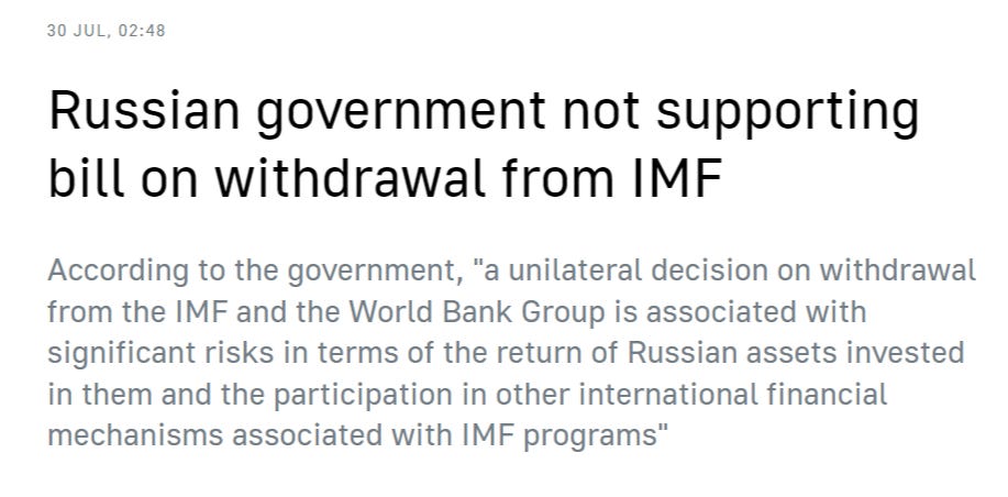 In fact, just a couple months ago the communist party of Russia (which is the second most powerful party in Russia) entered a bill to the State Duma for full Russian withdrawal from the IMF and World Bank associations. The bill was roundly rejected.