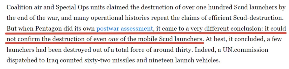 Lastly—in case anyone’s forgot, the U.S.—which is said to be the greatest superpower—spent years “interdicting” ISIS and various other groups in a far more accommodating open terrain, with literally zero AD to worry about, and still couldn’t hit anything but the odd civilian transport, wedding, etc. In the Gulf War, the U.S. spent 9 months hunting Scuds and a special Pentagon report concluded afterwards that they didn’t find a single one: