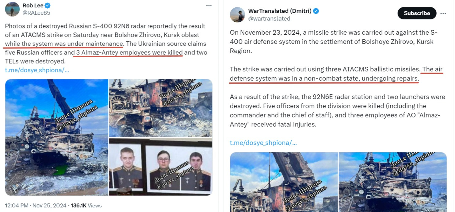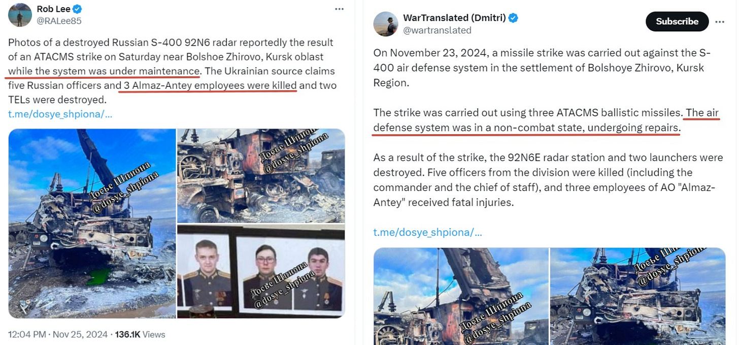 You see, even Ukrainian sources admit they could only hit the S-400 because it was literally defunct and not in operation, “undergoing maintenance”. This is attested by the fact that the one source even claims that Almaz Antey employees were killed—likely mechanics from the S-400’s manufacturer.