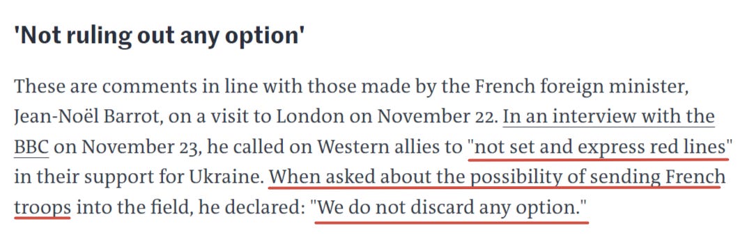 So, some French Foreign Minister is first asked about the possibility of sending troops and he merely suggests from his own opinion that “no red lines should be set”. That’s it. Just another vague suggestion or some nobody’s unasked for insertion.