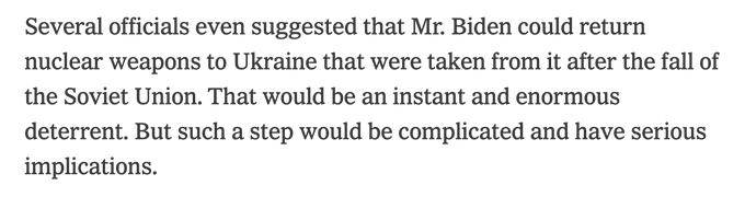 “US and European officials have discussed…including providing Kiev with nuclear weapons”—and it links to the very NYT article from above. Yet no where in that article is this “discussed”, rather juvenilely proposed by an “anonymous” writer’s self-insert.