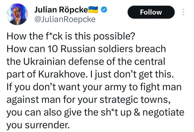Meanwhile Julian Roepcke inadvertently debunks ‘high Russian losses’ during assaults by admitting a mere 10 Russian troops are capturing entire town centers to no resistance: