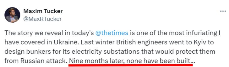 But where the story takes a tragicomic turn is the UK’s Sunday Times writer explaining how British engineers were meant to construct protective bunkers for Ukraine’s substations, only to result in not a single one being built:
