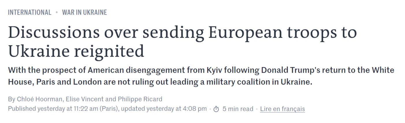 In fact, later in the article they attempt to curb expectations by then implying that any such troops would be for a peace keeping force after cessation of hostilities. That’s because Biden signaled to dump the conflict on Europe, and Trump seeks to implement a ceasefire along the contact line—so the thought goes that European troops may have to be sent as a kind of KFOR force.