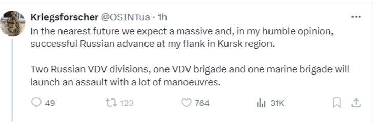 As for the frontline, things get worse and worse. A Ukrainian officer actually on the front reports soon Kursk will be swarmed: