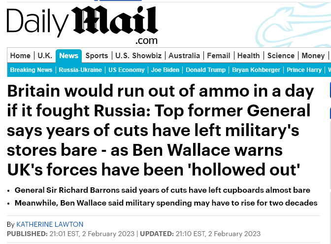 Joining in the chorus of the suddenly gunshy, the cloaca of the DailyMail sputtered that the poor British military would be completely depleted of ammo in only a day against the Russian forces.