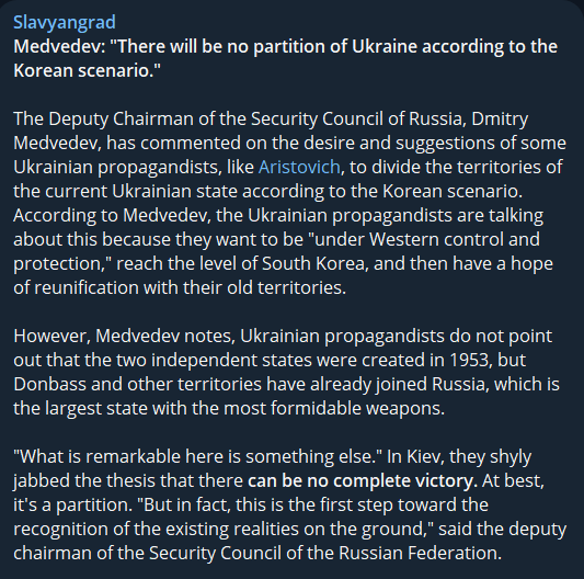 Now, (circling back to the beginning) Arestovich proclaims the likelihood of a ‘Korean’ DMZ scenario in his latest videos. And though we jump to characterize it as an admission of defeat on his behalf, it is in actuality in line with his original thesis from 2019—the brief armistice, followed by re-armament and subsequent war.