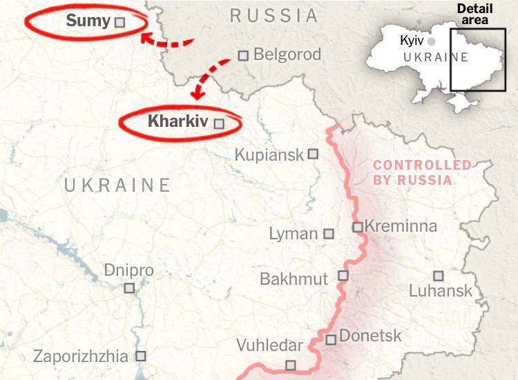 Onto the second thing: there’s been a recent spate of suggestive attacks by Russian forces. Reports have continued for several days now that Russian forces have shelled AFU positions in Sumy from across the Russian border. This is interesting and obviously suggestive of a possible ‘softening up’ operation for a potential Sumy incursion in the next phase, as per many of the forecasts, including our own from Part 2.