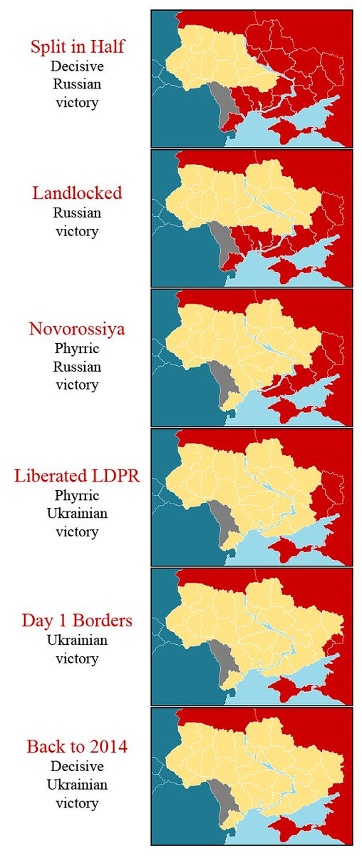 We can promptly strike off the ‘Decisive Ukrainian Victory’, the ‘Day 1 Borders Ukrainian Victory’, and the ‘Liberated LDPR Pyrrhic Ukrainian Victory’. The first two are utterly inconceivable. The third is remotely possible in some parallel world where Russian command staff completely drops the ball in an unprecedented way—but still highly unlikely.