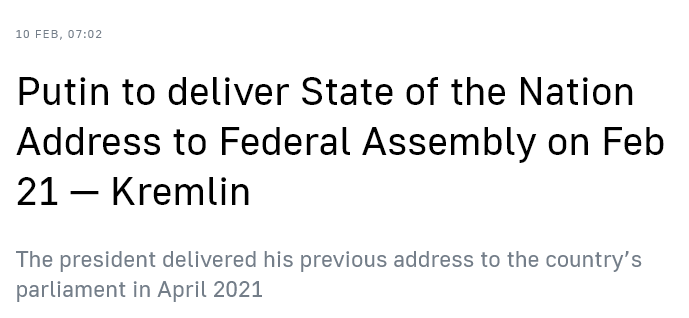 Firstly, it’s now official that Putin will in fact deliver his ‘State of the Nation’ address to the federal assembly on February 21st.