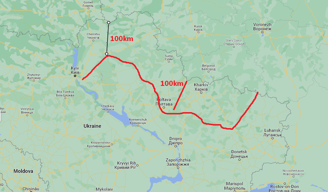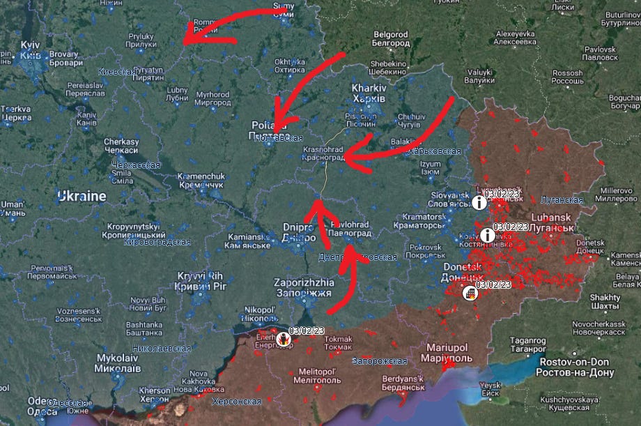 This vector is the more traditional, safe route of Russian forces pushing up from Zaporozhe to cut Donbass from the south. Russian forces pushing down from Belgorod region into Kharkov, possibly from Kursk into Sumy and Bryansk into Chernihov.
