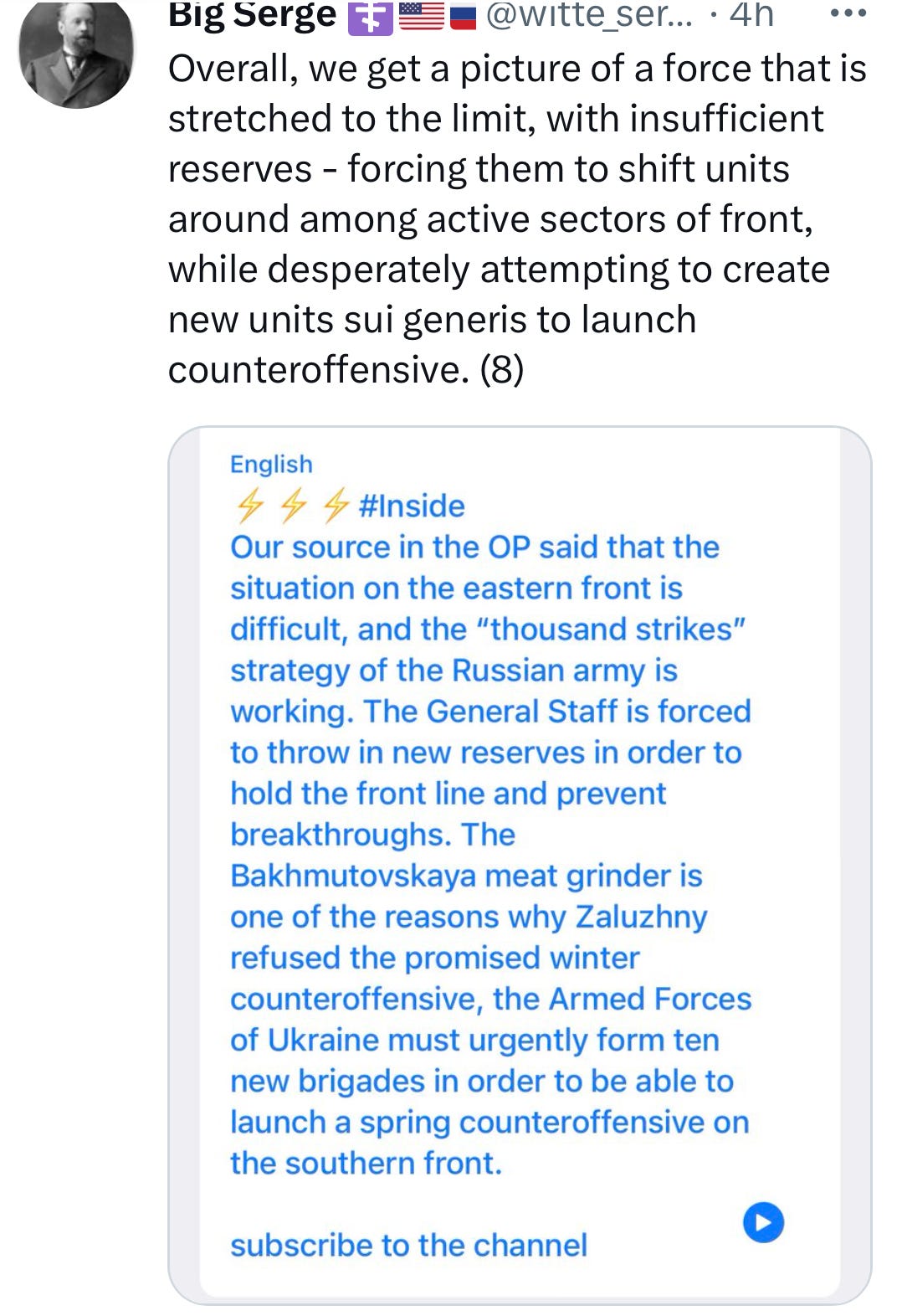 To launch a more stealthy, ‘undeclared’ offensive, one along every possible axis, utilizing ghost brigades of smaller forces that wear down the AFU with the ‘thousand cuts’ method, could be a strong way to mitigate NATO’s spysat and SIGINT advantages. That’s to say we may not even see one obvious “grand rush” like Feb. 24, 2022, hundreds of helicopters blacking out the skies, 40 mile convoys and huge fleets of paratrooper landings, etc. We may very well already be in the offensive, conducted in a far more clandestine fashion, hewing to the strictures of maskirovka and misdirection. After all, Russia is currently advancing nearly on every front, so why should they do a mad berserker thunder-run like last time?