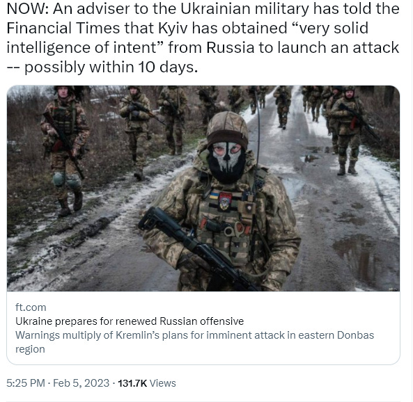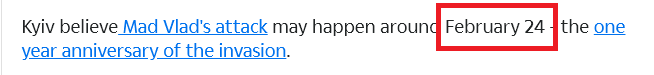 Here, Alexei Danilov, Ukrainian National Security Secretary, also states that Russia will likely attack in the next 2-3 weeks, possibly on the exact Feb. 24 anniversary of last year’s attack.
