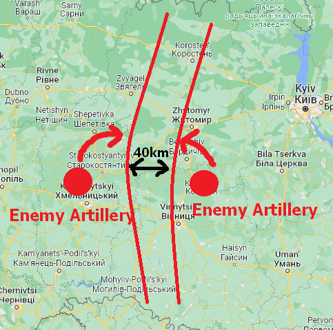 So the solution is, your salient has to be a certain width, such that the center of it can be safe from most artillery so your command structures, supply dumps, etc., will be relatively protected. Of course, with the modern advent of guided HIMARs and such, with much longer ranges, this becomes a bit more moot. But those are still relatively low in number compared to the main artillery threat numbering in the hundreds/thousands. This means the salient must be, let’s say, 80km wide, so a padded ‘safe space’ exists in the center where artillery on both left and right flanks cannot reach. Now if you want to protect against HIMARS (90km range) your salient needs to be in excess of ~200km wide: