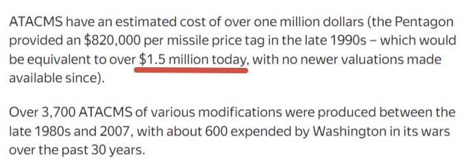 In fact, we can even conversely say that rather than having no effect, the strikes negatively effect the Ukrainian war effort because—as I wrote above—Ukraine is wasting its few precious ‘wunderwaffe’ on inconsequential strikes when those ATACMS could have been far better served hitting significant military targets like C2 nodes, ammunition sites, etc., in Russia’s rear somewhere closer to the actual front in Donbass.