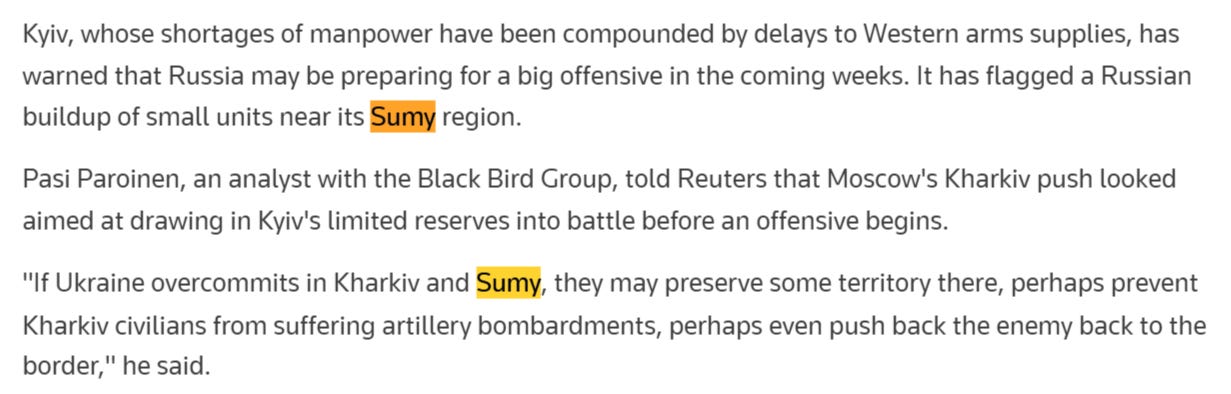 The Ukrainian post claims Russia is bringing its equipment closer and closer to the line of contact on the Sumy border. Another new Reuters report likewise cites Sumy as an upcoming front: