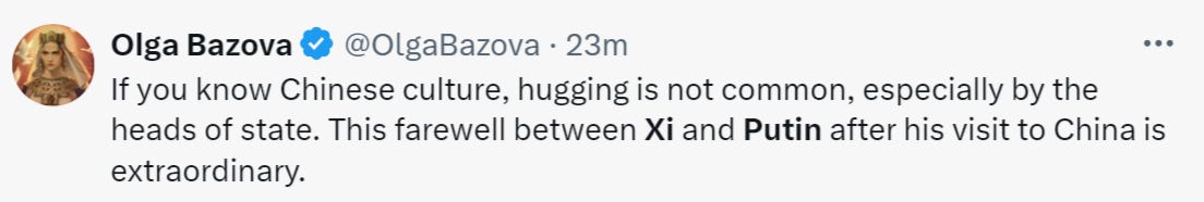 Meanwhile, in a very rare sign of personal affection that goes beyond mere politics, President Xi went so far as to initiate a hug with Putin: