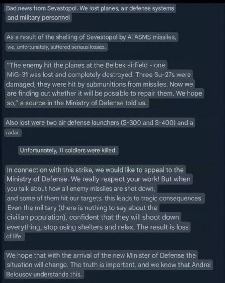 2. As I said, Russia has removed its most valuable assets from those bases: the Su-35s, Ka-52s—i.e. things which actually serve on the frontline and contribute to the war. The targets hit mostly represent AD systems—which, once again, merely guard the already strategically irrelevant area—as well as older jets used in secondary functions like surveillance around the Black Sea. Yes, the Mig-31s are a bit of an exception there. But given that ATACMS cost over $1M each per missile, 16 of them launched on a mostly irrelevant base is quite the frivolous expenditure to an extent.