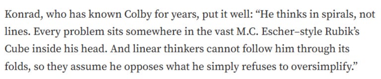 Of course, if you really pay attention to the author’s description of his genius, you quickly realize Colby is not the great thinker he is made out to be, but is rather a typical one-dimensional American neocon strategist capable only of processing the world through a shallowly binary and adversarial mindset, which is what sets him apart from the people who run policy in civilizational states like China. American neocons can operate only from the imperial vantage, utilizing the modalities of hostility and game-theoretic resource control.
