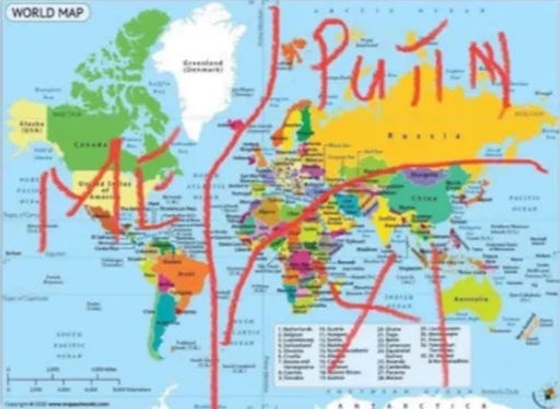 It is in essence a repudiation of this famous meme making the rounds, which implies Trump is willfully dividing up the world by ceding remaining hemispheres to Putin and Xi.