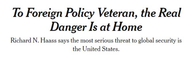 That was never a thought this global strategist would have entertained until recently. But in his mind, the unraveling of the American political system means that for the first time in his life the internal threat has surpassed the external threat. Instead of being the most reliable anchor in a volatile world, Mr. Haass said, the United States has become the most profound source of instability and an uncertain exemplar of democracy.