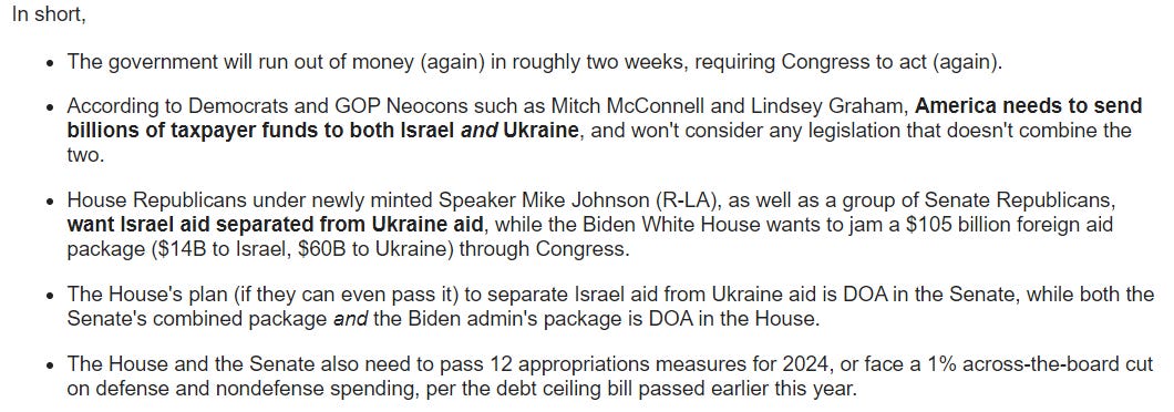 So the House plan to separate Israel aid from that of Ukraine is completely dead-on-arrival in the Senate. But the Senate’s plan to combine the two is completely DOA in the House. Neither side can agree and it appears no one knows, precisely, what happens if the deadlock continues until the budget runs out.