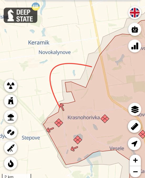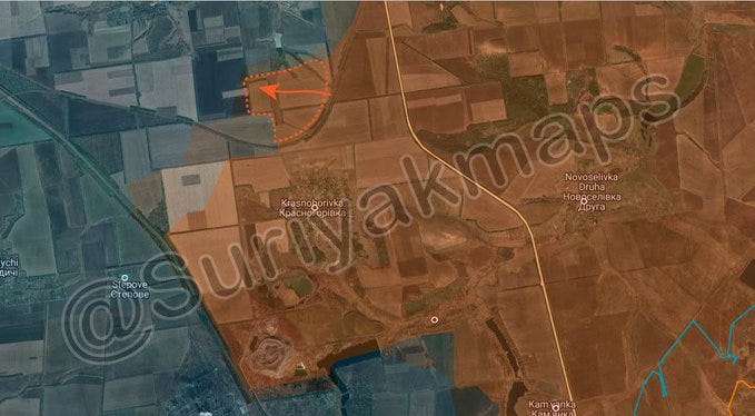 Not long after that post, which I myself dismissed as perhaps deliberate misdirection, it was announced that the AFU actually launched their own counterattack from the north in order to try to cut Russian forces toward Krasnogorovka. But this was followed by reports, like the below from Rybar, that Russian forces have likewise struck out toward Keramik there: