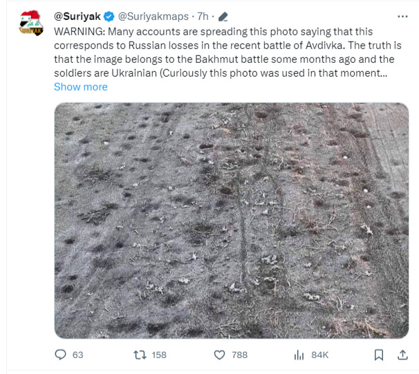 Some accounts have even pointed out how desperately pro-UA supporters have been trying to gin-up fake losses, for instance posting this one infamous photo of a field of corpses and trying to pass it off as Russian “meat assault losses” in Avdeevka. Only problem is, those were Ukrainian dead from Bakhmut as many well-trusted accounts have pointed out: