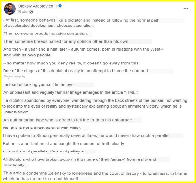 The article veers into corruption with the same old stories that we all know are ever-present. The only interesting take away is that Arestovich later commented on the article, not only agreeing with the corruption bits but painting Zelensky in exactly those lone, detached dictator tones: