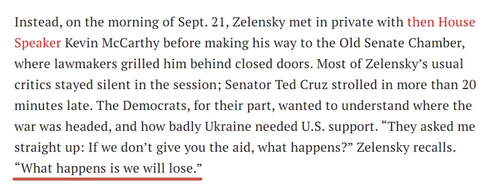 Zelensky very forthrightly admits that if he doesn’t get further aid, Ukraine will lose: