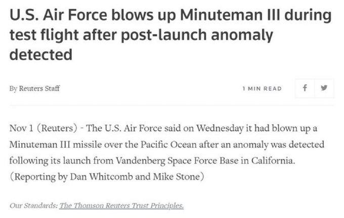 An unarmed USAF Minuteman III ICBM has been "safely terminated over Pacific Ocean at 12:06 a.m. due to an anomaly during a test launch from Vandenberg Space Force Base, California."