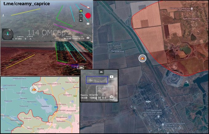 According to this, GPS tracking shows that the AFU no longer is using that MSR supply route that runs from Avdeevka to Orlovka just west of it. The part about movement being carried out by rail makes no sense since Russia most definitely controls the rail line at this point, so I’m not sure what they were getting at there—perhaps they meant alongside the railway, which does have a road. In fact that’s the road seen being used by the evacuation Bradley in the earlier video.