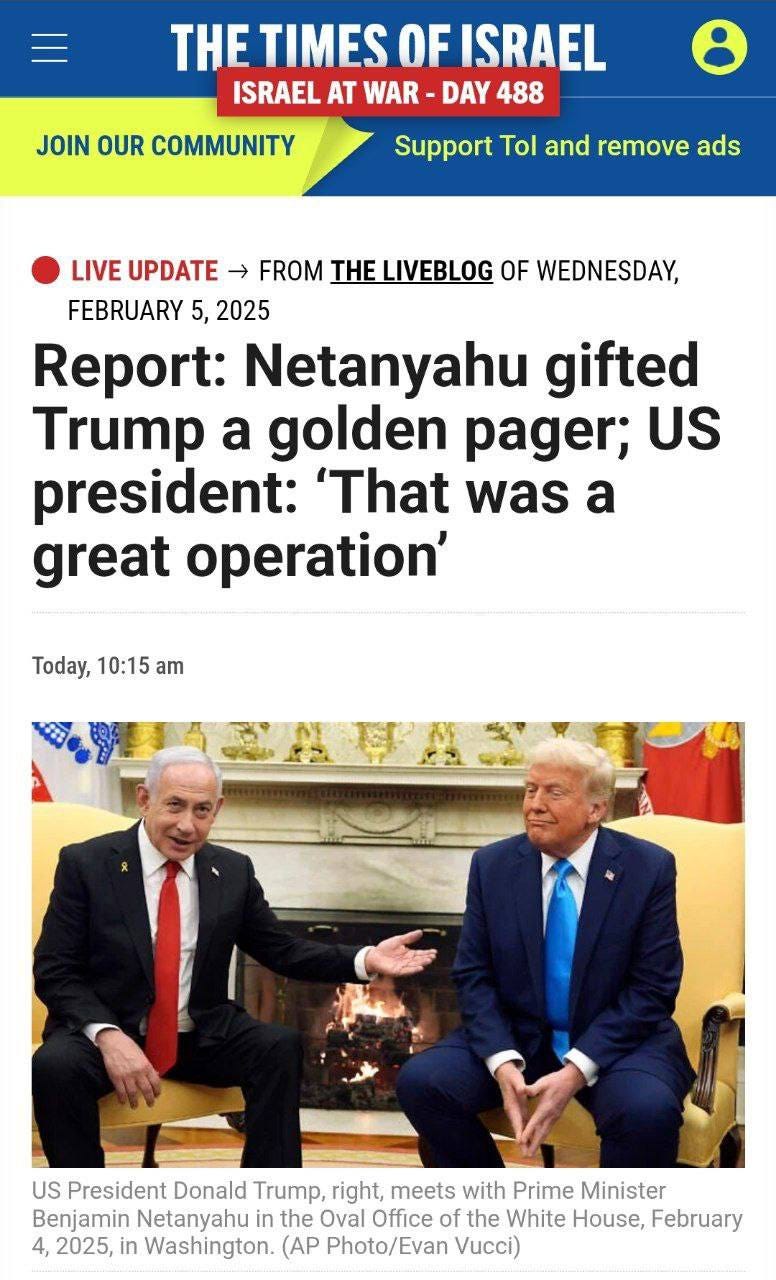 Netanyahu presented Trump with two pagers at a meeting on February 4 — "a regular one and a gold-plated one," the prime minister's office stated. Trump responded by saying that "it was a grand operation."