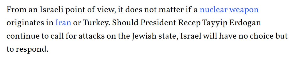 You see how quickly Turkey is displacing Iran, in almost the selfsame role? Soon it will be Turkey in the country at risk of being struck by IAF bombs while funneling weapons into Syria, and being accused of perpetually ‘coming close to getting the A-Bomb’.