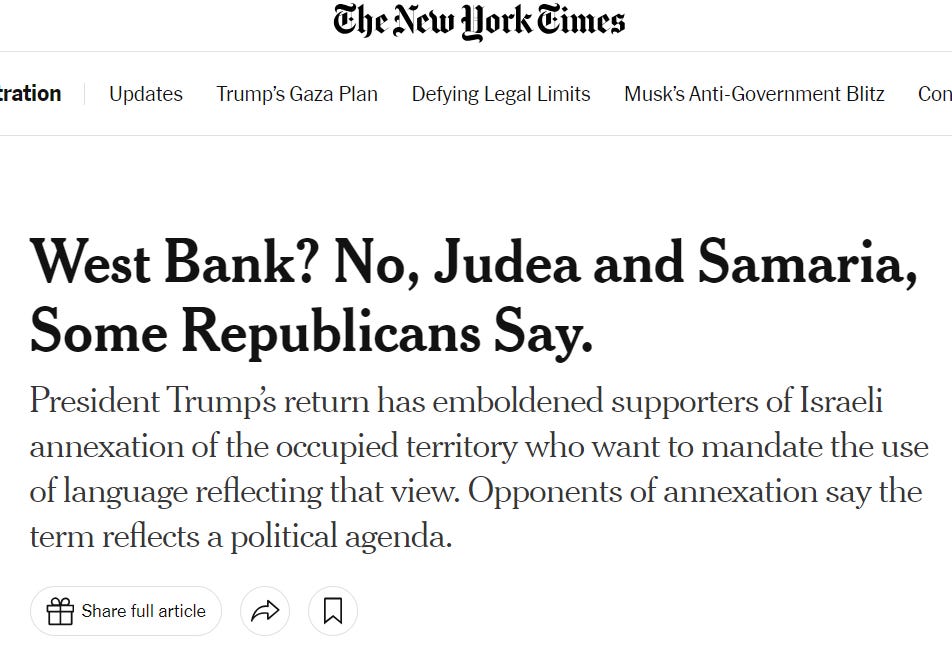 And as for those brawny America First congressmen? Well, you can forget the West Bank, too—the new ‘guidance’ from the top is the bird’s the word, and the bird’s been blacklisted. No more “West Bank”, I present to you the Israeli provinces of Judea and Samaria: