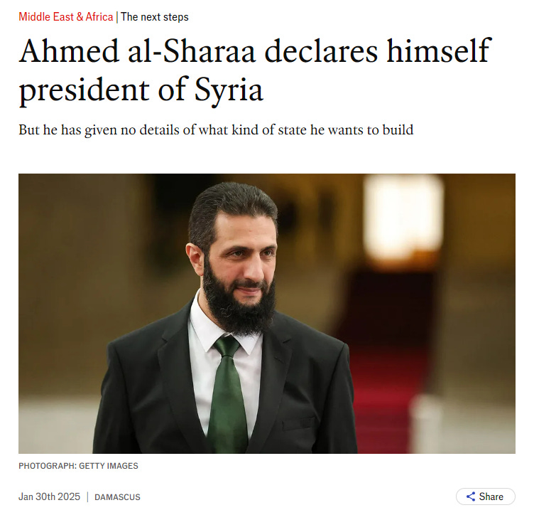 This all came days after Jolani finally formally declared himself president of Syria, rather than some ambiguous ‘transitional leader’: