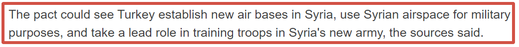 That’s right, foremost amongst discussions is the deployment of full-on Turkish military and airbases throughout central Syria, as well as training of a new Syrian army by Turkish forces.