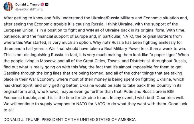 As I was writing the previous report, Trump had tweeted something which has nearly “broken the internet”—at least the Russo-Ukrainian political side of it. I figured it would be more fitting to do a quick separate article on the matter, given that it seemed immediately obvious to me what was happening, and required no further rumination.