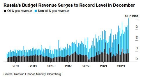 ▪️ Total revenue in December was more than 4 trillion rubles ($40 billion), up 28% from the same month last year, according to the Finance Ministry.