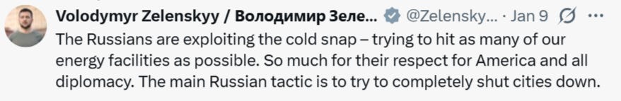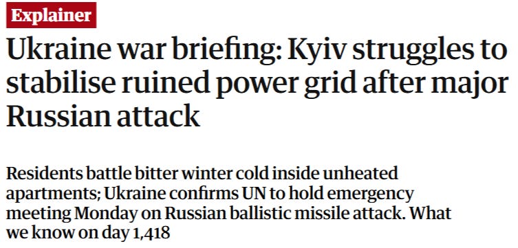 Today’s news brings us more grim updates about the state of Ukraine’s energy grid. The lights have still been out in much of Kiev and many other large cities after a long cold snap, and things do not seem to be improving much.