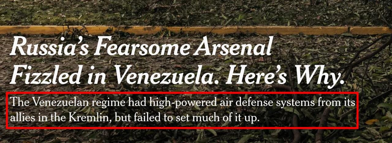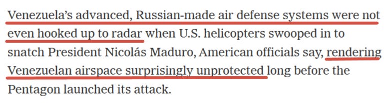 As a last noteworthy update, another bit of confirmative news today from NYT which further corroborated theories about how Venezuela’s air defenses were essentially non-existent during Trump’s “masterstroke” raid on Maduro: